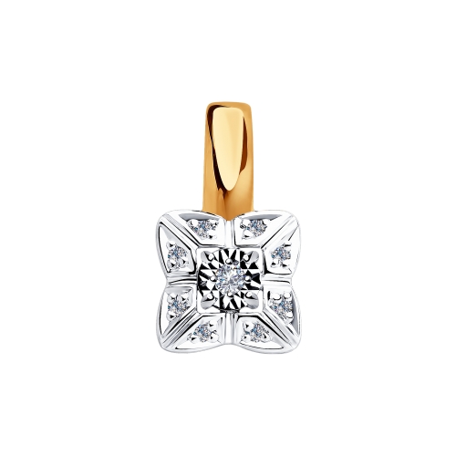 Великолепная подвеска из комбинированного золота 585 пробы с 9 бриллиантами. Подвеска эффектно оформлена вставками из белого золота с сияющими бриллиантами. Украшение станет прекрасным дополнением к повседневному и праздничному образу. Приобретайте универсальное украшение по выгодным ценам в магазинах Мир Золота.