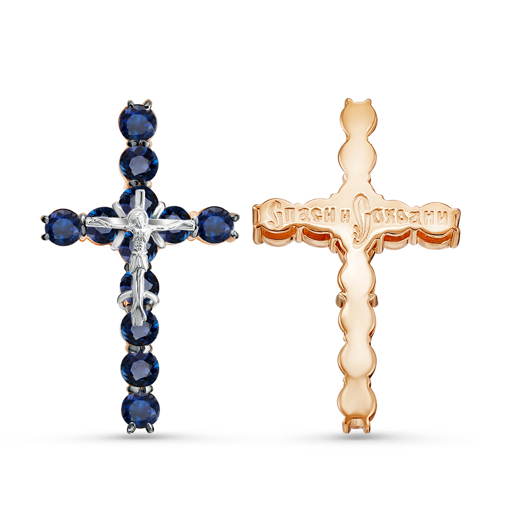 Православный крестик с распятием выполнен из красного золота 585 пробы в изящном дизайне. Распятие выполнено из элементов белого золота на фоне дорожек из эффектных синих сапфиров круглой огранки. Православный крестик станет символом веры и высшей Божественной силы. Приобретайте религиозную подвеску по выгодным ценам в магазинах Мир Золота.