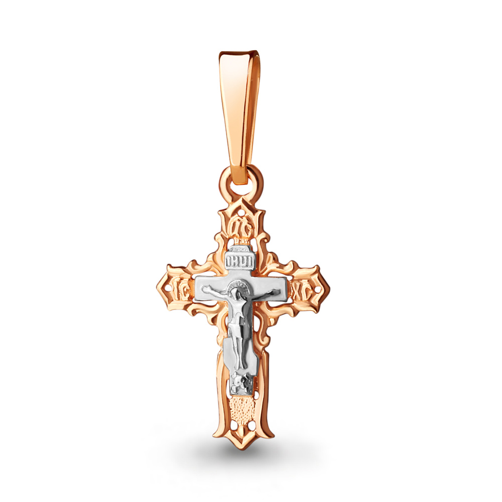 Православный золотой крестик оригинальной формы из комбинированного золота высшей пробы станет выразительной деталью духовного образа. На обратной стороне изделия молитвенные слова - «Спаси и Сохрани». Крестик подойдет для священного таинства крещения девочек и мальчиков. Откройте для себя восхитительный мир ювелирных украшений AQUAMARINE в магазинах Мир Золота.