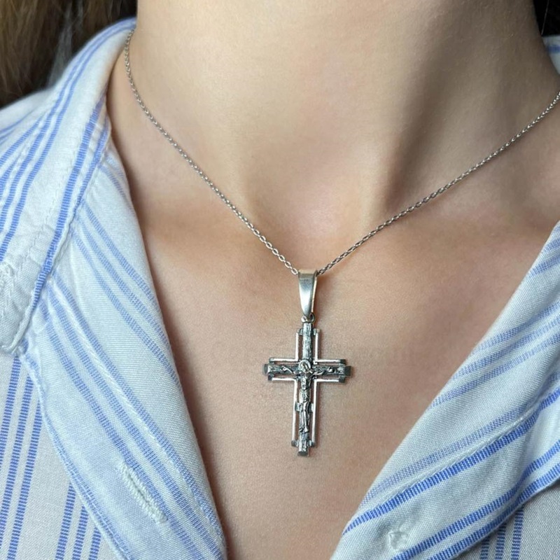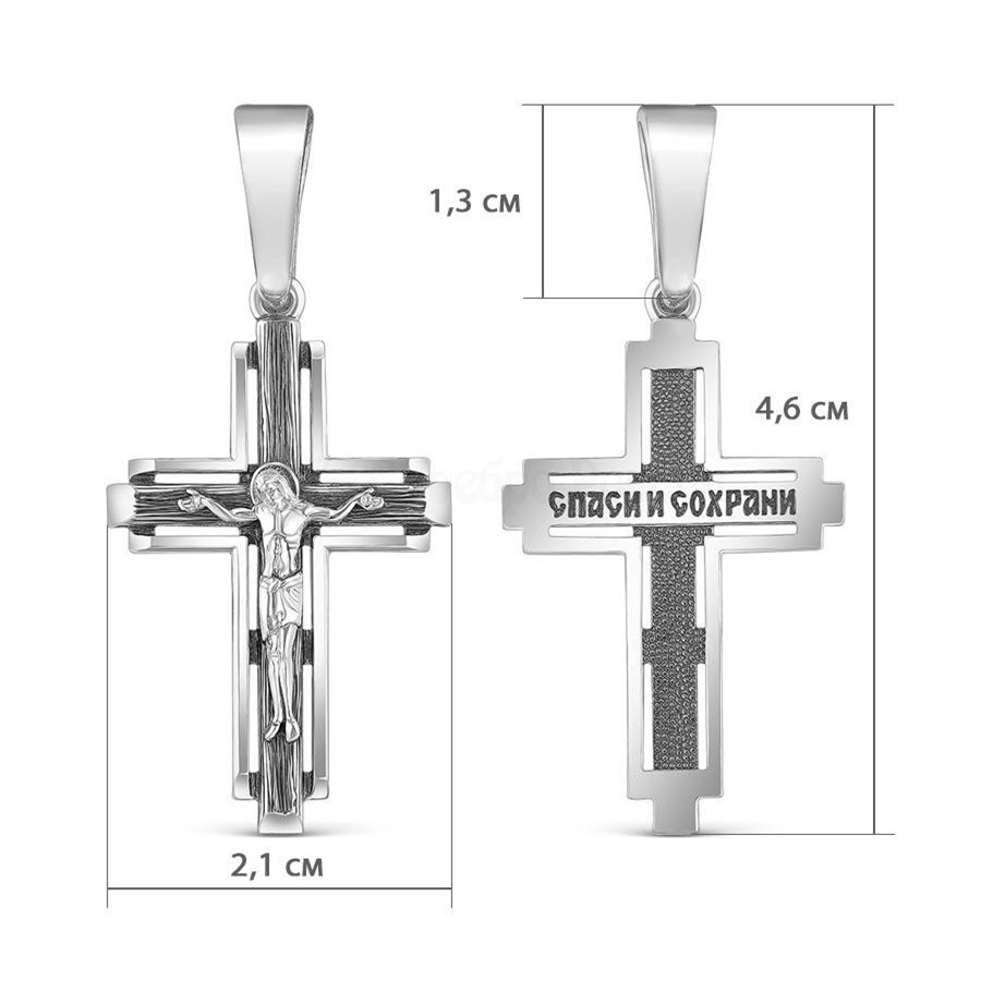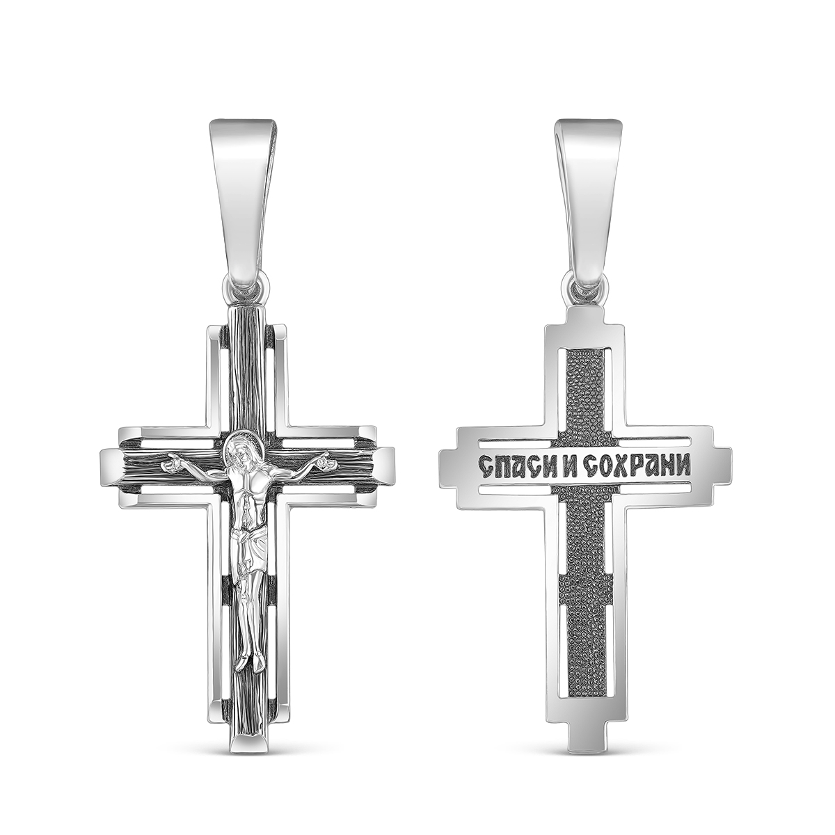 Христианский крестик с распятием и гравировкой «Спаси и сохрани» на оборотной стороне выполнен из чернёного серебра 925 пробы без дополнительных вставок. Сдержанный дизайн с сочетанием православных традиций и новых форм отлично впишется в современные образы, эффект чернения придает украшению выразительный вид. Приобретайте крестик по выгодной цене в магазинах Мир Золота.