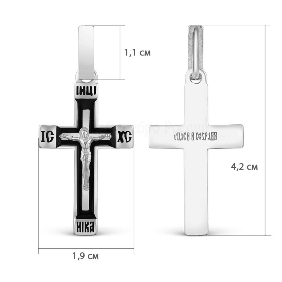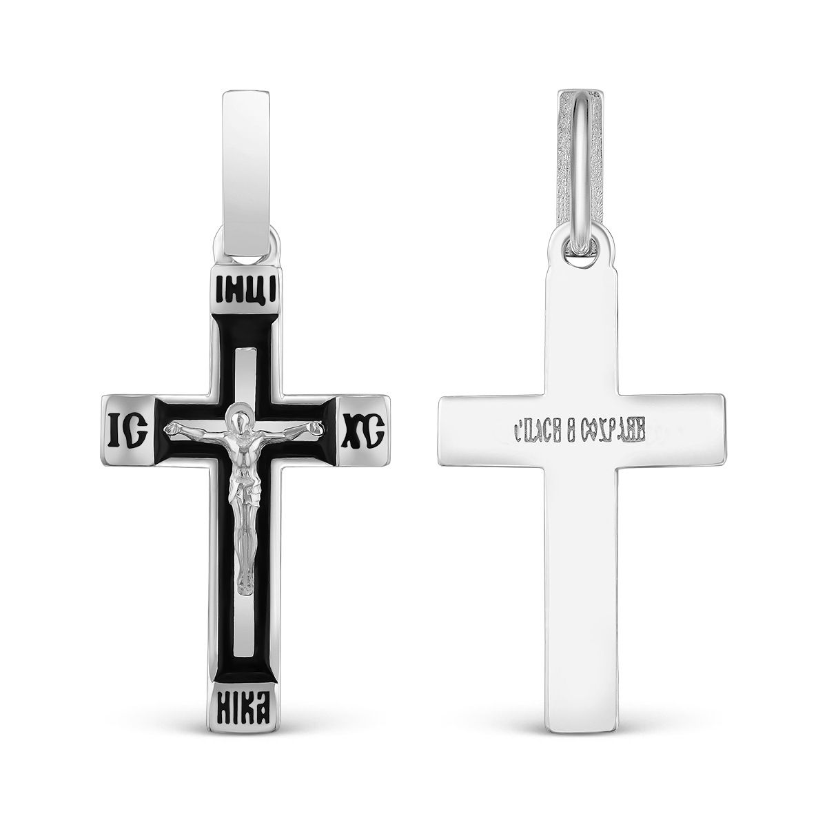 Крестик христианский с распятием и гравировкой «Спаси и сохрани» на оборотной стороне выполнен из родированного серебра 925 пробы. Вставка с чёрной эмалью придает изделию более выразительный и контрастный вид, лаконичный дизайн отлично впишется в современные образы. Защитное покрытие родием препятствует потемнению серебра, и надолго сохраняет первоначальный вид изделия. Покупайте крестик выгодно в магазинах Мир Золота.