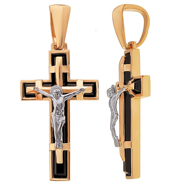 Стильный христианский крестик с распятием выполнен из красного и белого золота 585 пробы с черным агатом. Символичный аксессуар с контрастным сочетанием драгоценного металла и ювелирных камней станет выразительной деталью современного образа, и подчеркнет индивидуальность владельца. Приобретайте ювелирную подвеску по выгодной цене в магазинах Мир Золота.
