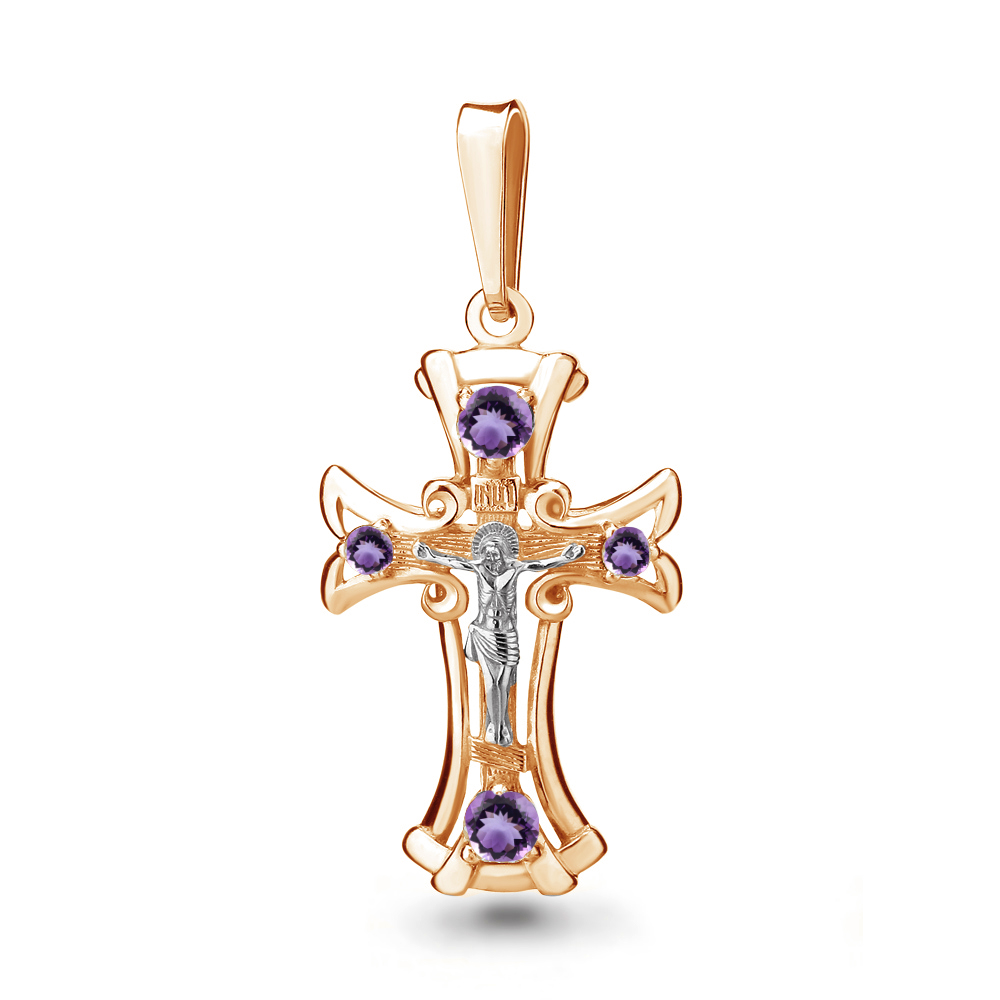 Крестик христианский с распятием, декорированный натуральными аметистами, выполнен из красного золота 585 пробы. Благородный блеск золота выгодно подчеркивает привлекательное сияние полудрагоценных камней. Христианский крестик, как символ истинной веры, станет вашим главным оберегом в жизни. Приобретайте подвеску выгодно в магазинах Мир Золота.