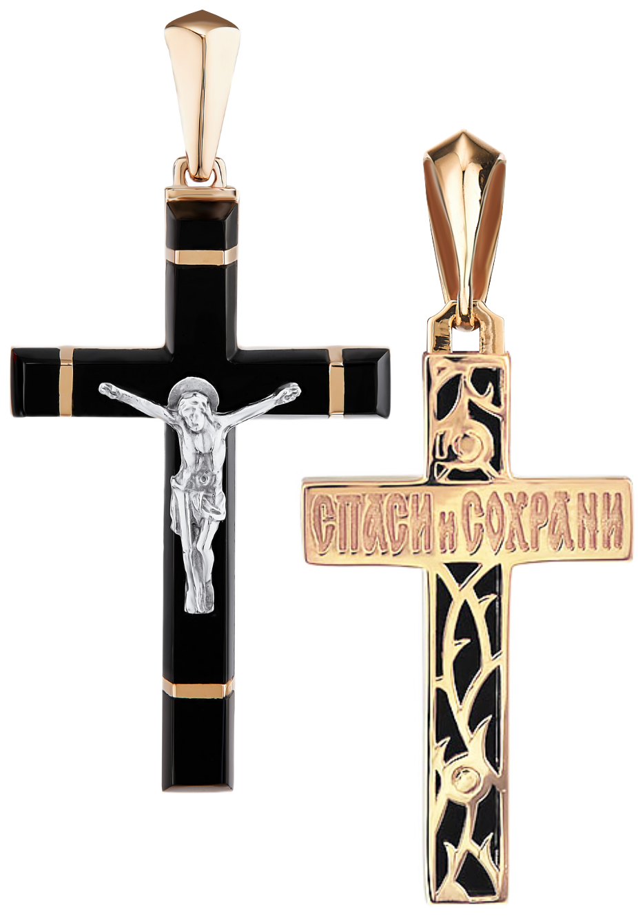 Христианский крестик с распятием и гравировкой «Спаси и сохрани» на оборотной стороне выполнен из красного золота 585 пробы с черным агатом. Великолепный крестик современного дизайна с насыщенным блеском агата станет стильной деталью выбранного образа, и надежным оберегом в жизни. Приобретайте украшение для себя или в подарок по выгодной цене в магазинах Мир Золота.