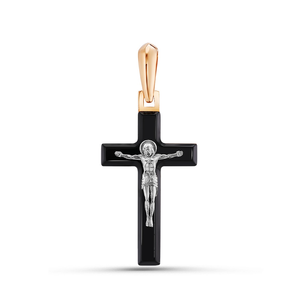 Христианский крестик с распятием из красного и белого золота 585 пробы с черным агатом станет яркой деталью повседневного образа. Символичный аксессуар с контрастным блеском золота и агата великолепно смотрится, и будет прекрасным выбором для подарка. Приобретайте ювелирную подвеску по выгодной цене в магазинах Мир Золота.