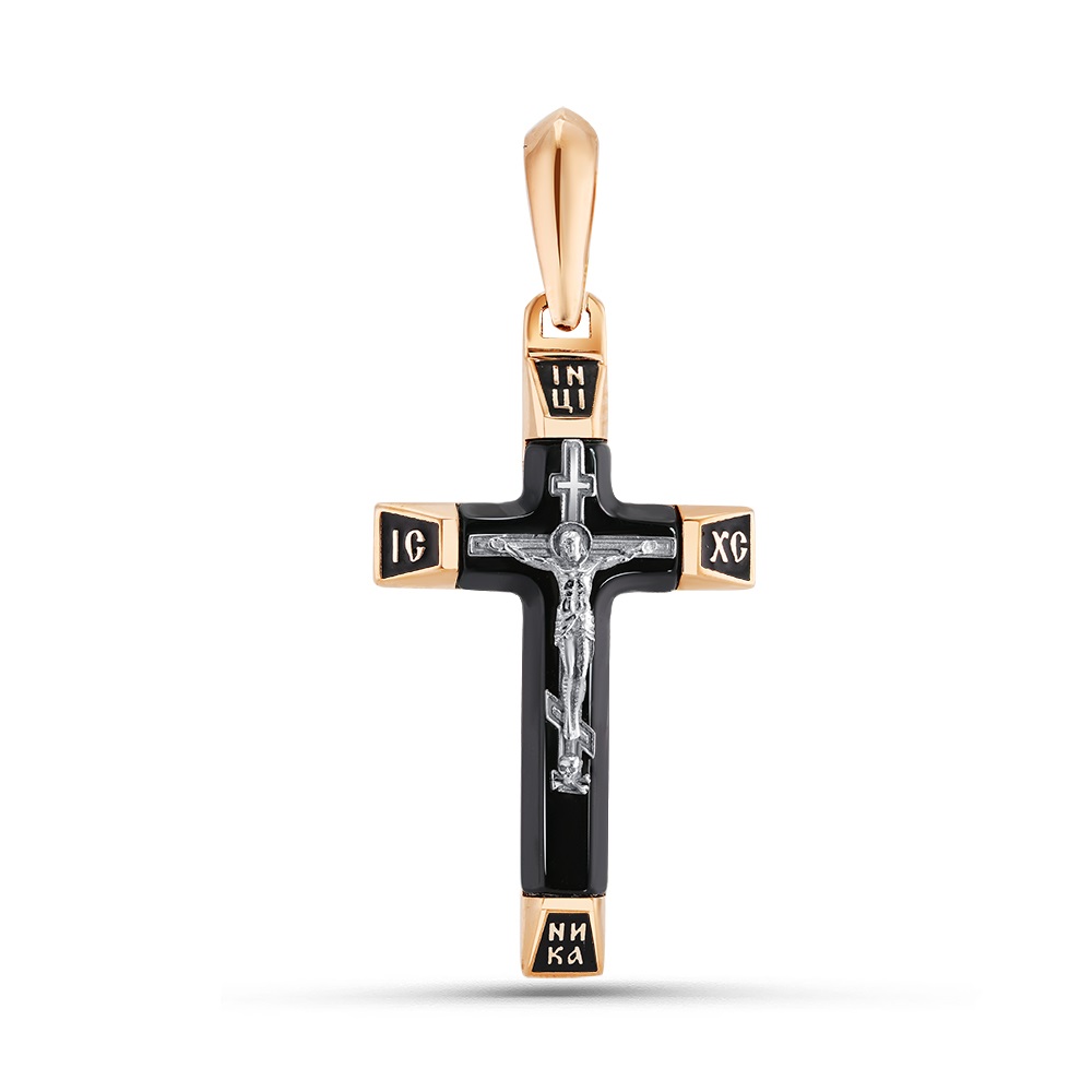 Христианский крестик с распятием из красного и белого золота 585 пробы декорирован черным агатом. Золотой крестик стильно смотрится, и станет заметной деталью повседневного образа и личным оберегом для владельца. Приобретайте символичный аксессуар для себя или в подарок по привлекательной цене в магазинах Мир Золота.