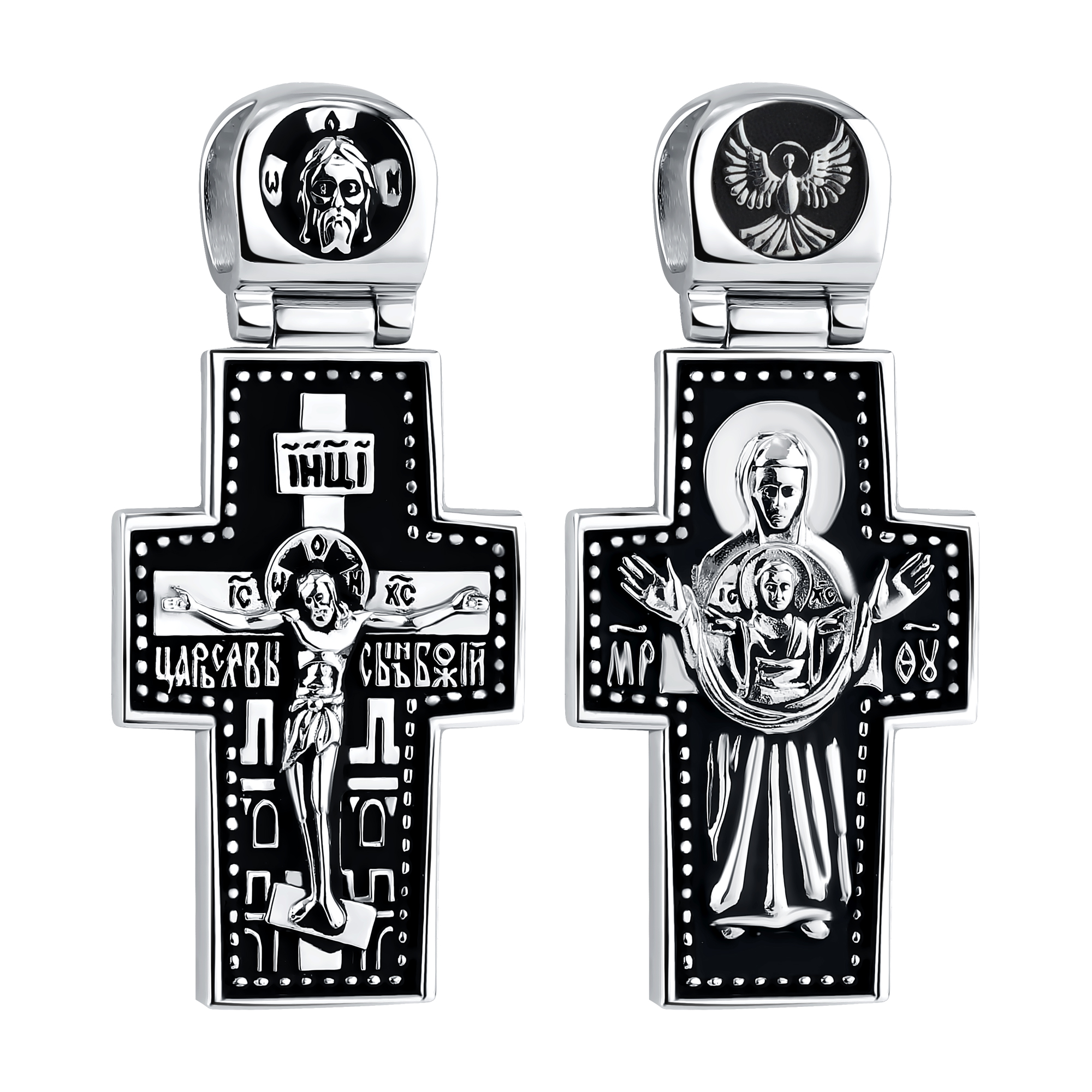 Крестик из серебра 925 пробы с покрытием лаком прекрасно дополнит ваш образ. На лицевой стороне изображено распятие с надписями «Иисус Назорей, Царь Иудейский» и аббревиатурой «I.Н.Ц.И», символизирующей победу Иисуса над смертью и его Воскресение. Также присутствуют монограммы «IC» и «ХС», обозначающие «Иисус Христос». Имя «Иисус» означает «помощь Бога» или «Спаситель», а титул «Христос» переводится как «Помазанник» и соответствует еврейскому слову «Машиах» — Мессия. Этот крестик, выполненный с тщательной проработкой деталей, объединяет в себе элегантный дизайн и глубокое символическое значение, делая его превосходным подарком для дорогих людей или для себя.