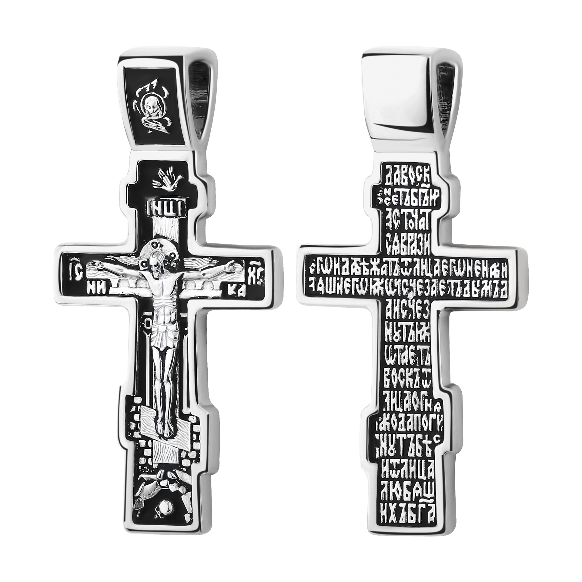 Крестик православный из серебра 925 пробы, подвергнутый оксидированию и чернению, приобретает глубокий и благородный вид. Эти техники обработки подчеркивают детали изделия, создавая контраст между светлыми и темными участками. Чернение добавляет крестику старинный шарм, делая его визуально более объемным и выразительным.