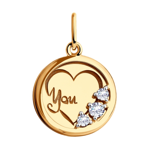 Изящная круглая подвеска с сердцем внутри заряжена на любовь и романтичные отношения. Подвеска украшена капельками ярких фианитов и надписью You - «Ты». Ты в моём сердце! Прекрасный подарок для сдержанных классических и ярких легких образов. Приобретайте великолепное украшение по выгодным ценам в магазинах Мир Золота.