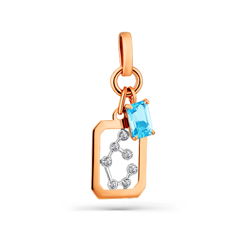 Необычная подвеска оригинального ювелирного дизайна из серии знаков зодиака, с ярким акцентом топаза swiss и символичным узором из прозрачных топазов, выполнена из красного золота 585 пробы. Необычное украшение с нежным блеском привлекательных камней станет стильным дополнением индивидуального женского образа. Приобретайте подвеску для себя или в подарок по выгодной цене в магазинах Мир Золота.