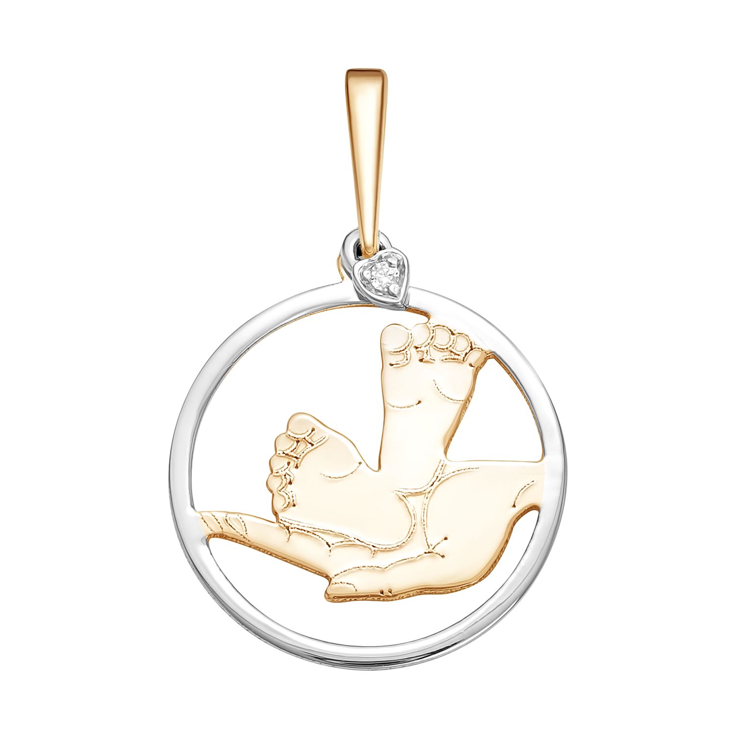 Изумительная подвеска с фианитом, выполненная из комбинированного золота 585 пробы, отлично подойдет в качестве подарка на рождение малыша. Символичное украшение с изображением пяточек младенца в нежной маминой руке является отражением заботы и материнской любви. Блеск прозрачного фианита эффектно дополняет нежную композицию. Покупайте украшение в подарок выгодно в магазинах Мир Золота.