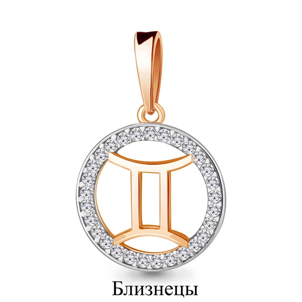 Изящная подвеска из красного золота сразу привлекает внимание своим ярким и теплым оттенком. В центре композиции находится символ знака зодиака Близнецы. Фианиты добавляют подвеске блеска и элегантности. Прозрачные камни сверкают всеми цветами радуги при попадании света, создавая эффект драгоценных бриллиантов. Такая подвеска станет отличным подарком для человека, рожденного под знаком Близнецы, а также подойдет тем, кто ценит изысканность и красоту ювелирных украшений.