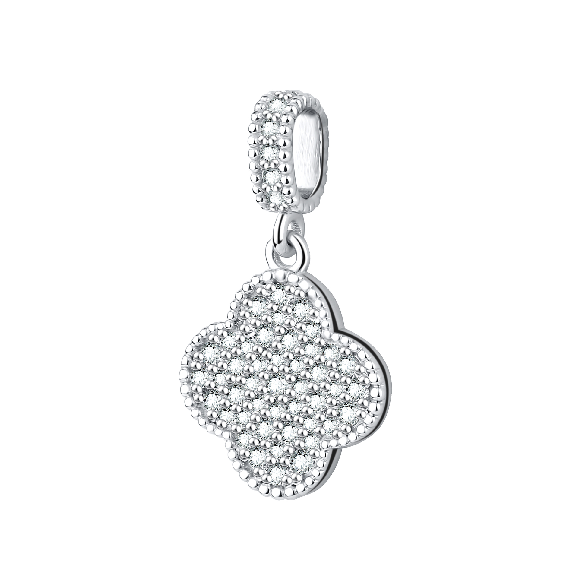 Очаровательное украшение выполнено в форме четырехлистного клевера, известного как символ удачи и счастья. Вся поверхность подвески усеяна маленькими сверкающими фианитами, придающими изысканный блеск и утонченность. Чистые линии и четкие контуры выгодно выделяют дизайн, а благородное серебро добавляет украшению шарма и элегантности. Этот талисман станет прекрасным дополнением к любому женскому образу, даря радость и позитивное настроение своей обладательнице.