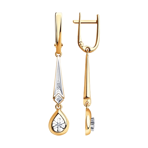 Восхитительные серьги с подвесками из красного и белого золота 585 пробы с бриллиантами. Серьги изысканно декорированы элементами из белого золота с кристальным сиянием прозрачных драгоценных камней. Украшение станет элегантным дополнением благородного женственного образа. Приобретайте серьги по выгодным ценам в магазинах Мир Золота.