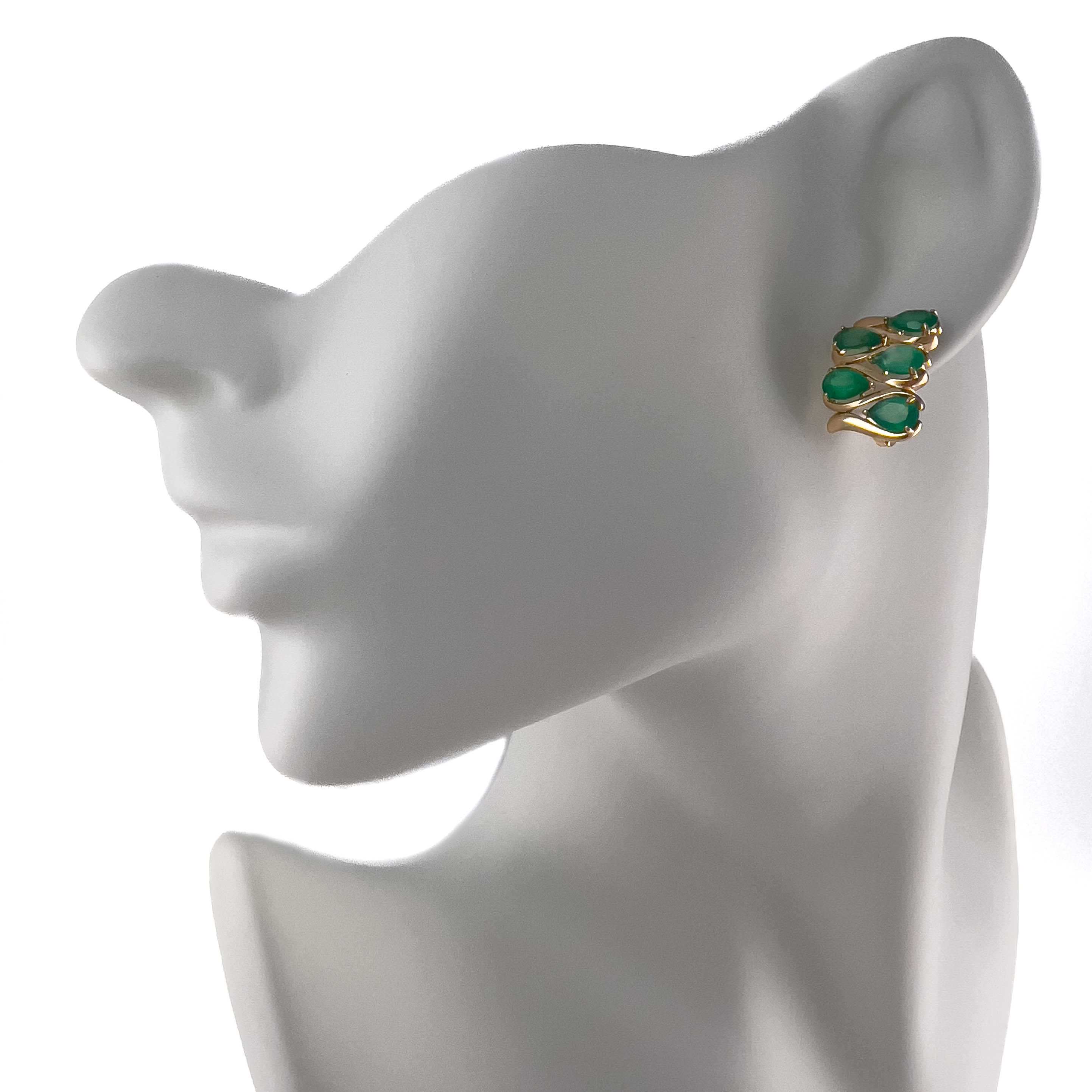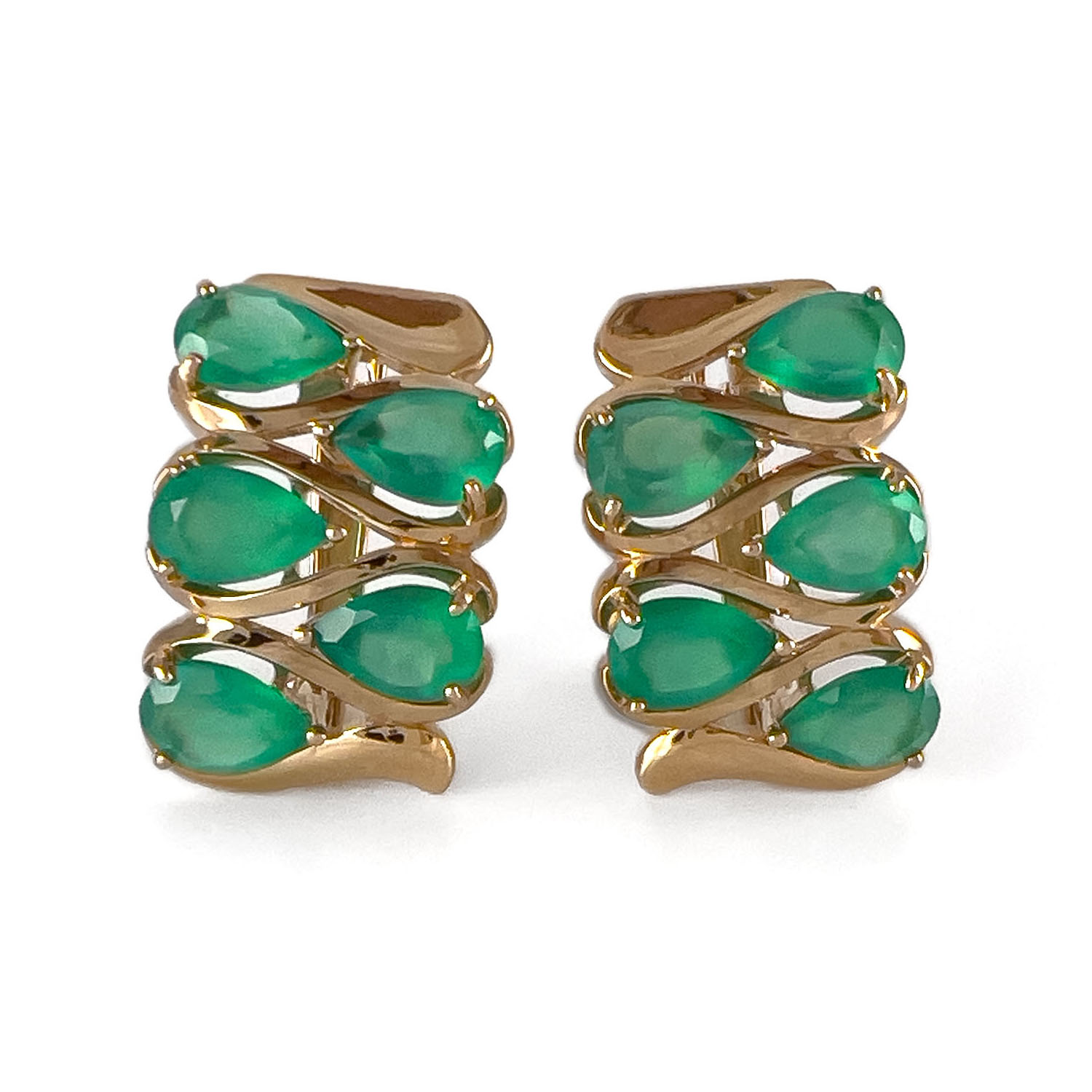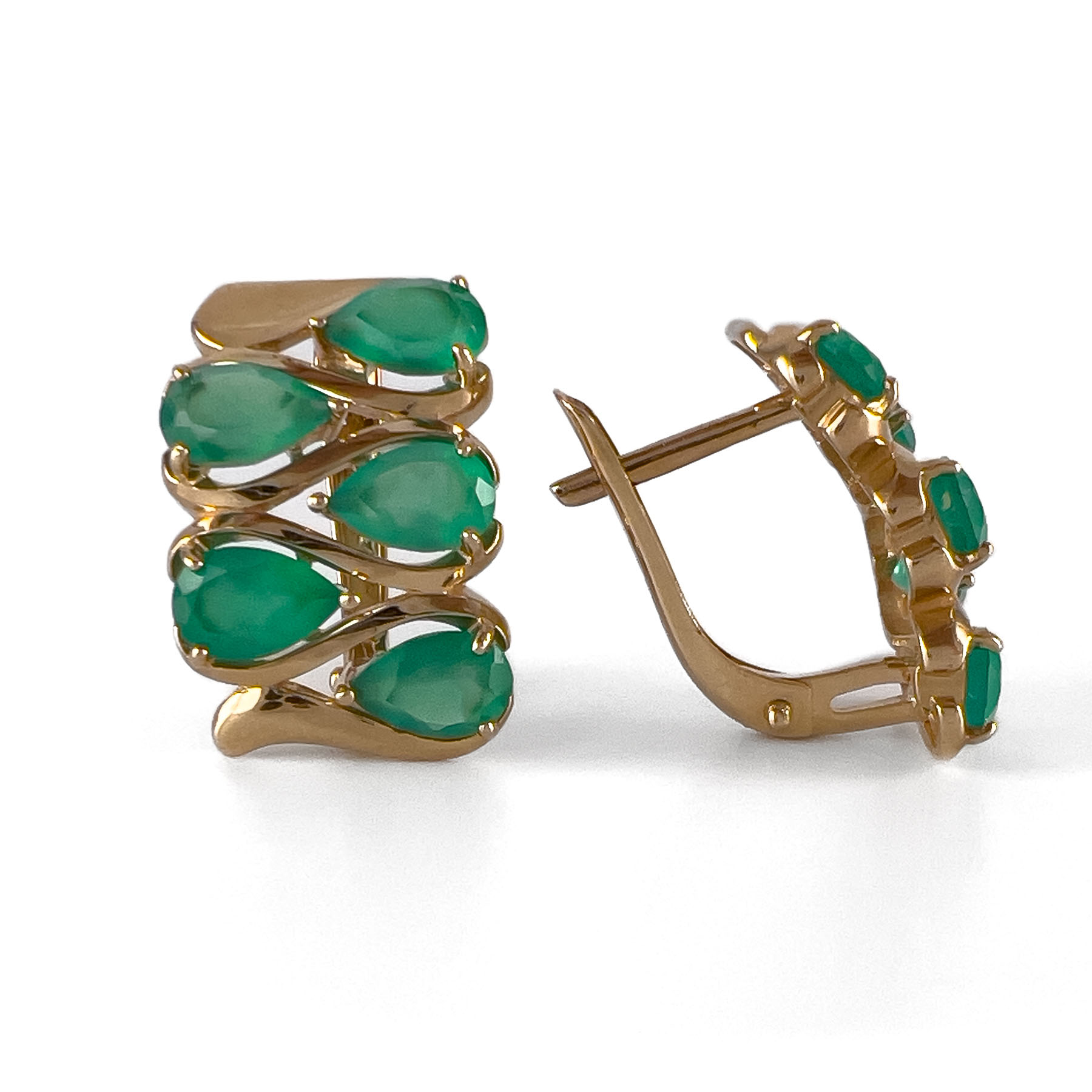 Статусные золотые серьги 585 пробы в элегантном сиянии агата идеальны для того, чтобы превратить обычный день в праздничный. Сочетание красного золота и глубокого зеленого цвета камней выглядит невероятно изысканно, дорого, но в то же время сдержанно и уместно. Украшение представлено ювелирным брендом Александра.