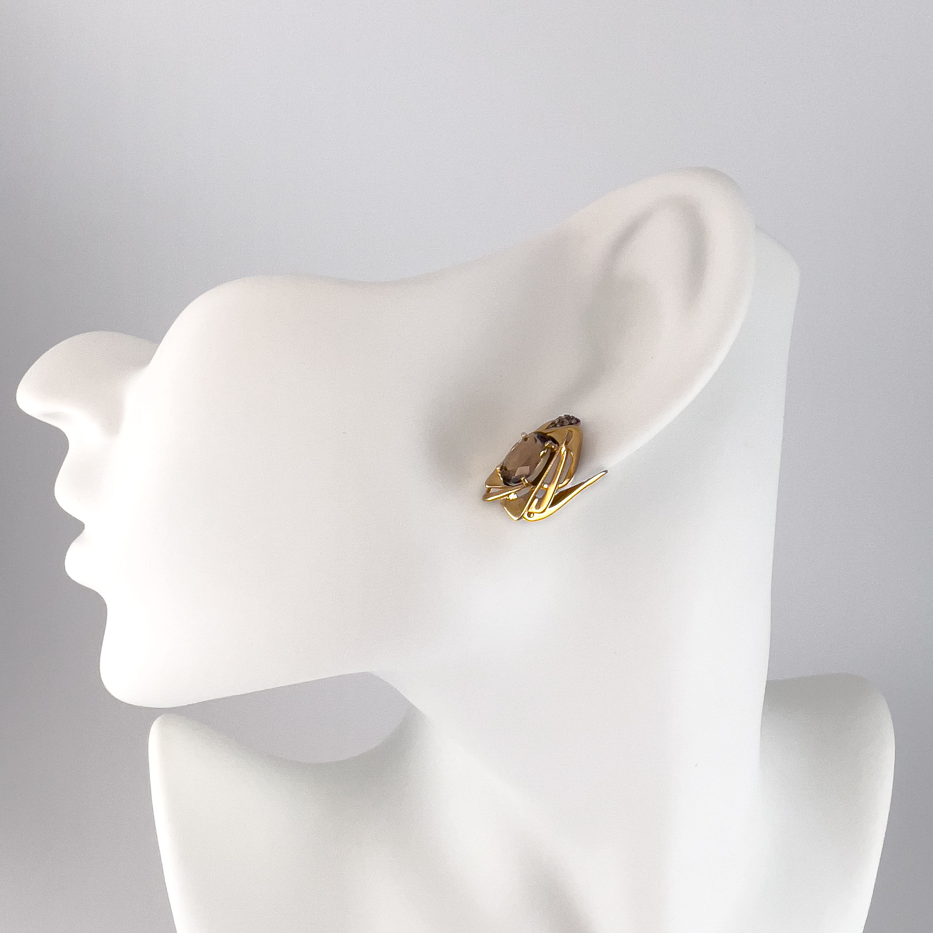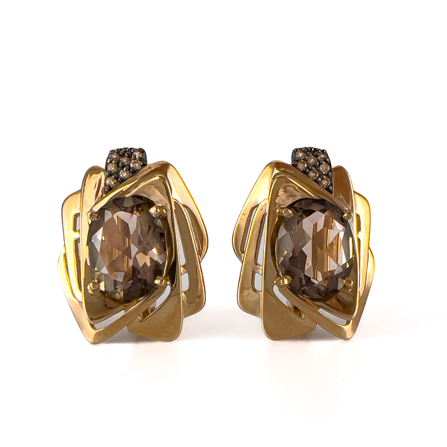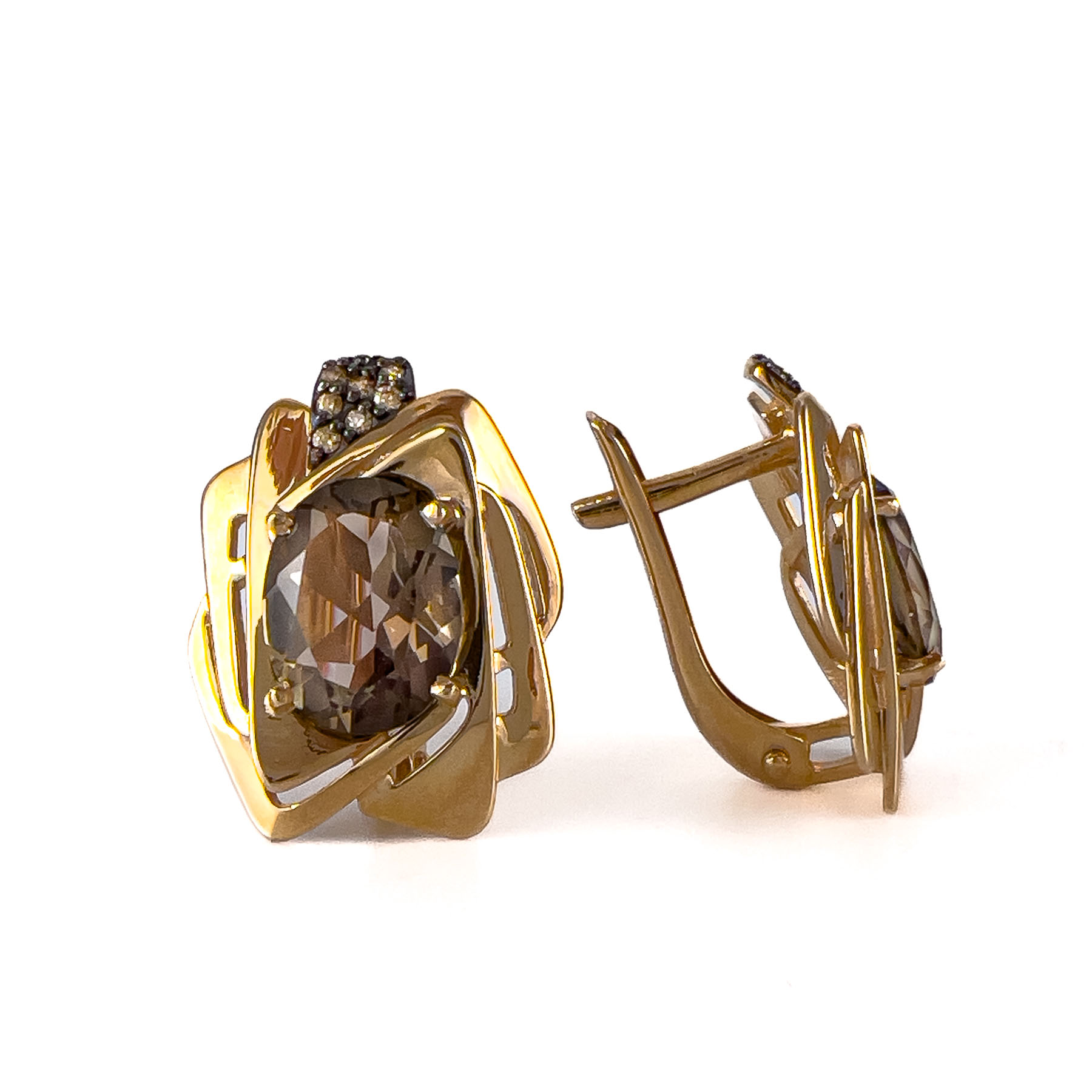 Стильные серьги из красного золота 585 пробы с фианитами и раухтопазом. Интересный дизайн позволяет раскрыть женский характер и расставить акценты для завершенного вечернего образа. Серьги застегиваются на удобный и надежный английский замок. Украшение представлено ювелирным брендом Александра.