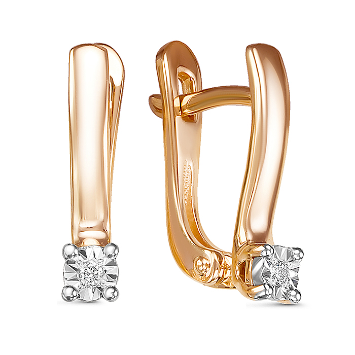 Современные классические серьги из красного золота 585 пробы с двумя акцентными бриллиантами подчеркнут безупречный образ своей прекрасной обладательницы. Алмазная грань белого золота, окутывающая бриллианты, делает их визуально больше и эффектнее. Удобный и надежный элегантный английский замок прослужит долго многие годы. Украшение представлено ювелирным брендом ИМПЕРИАЛ.
