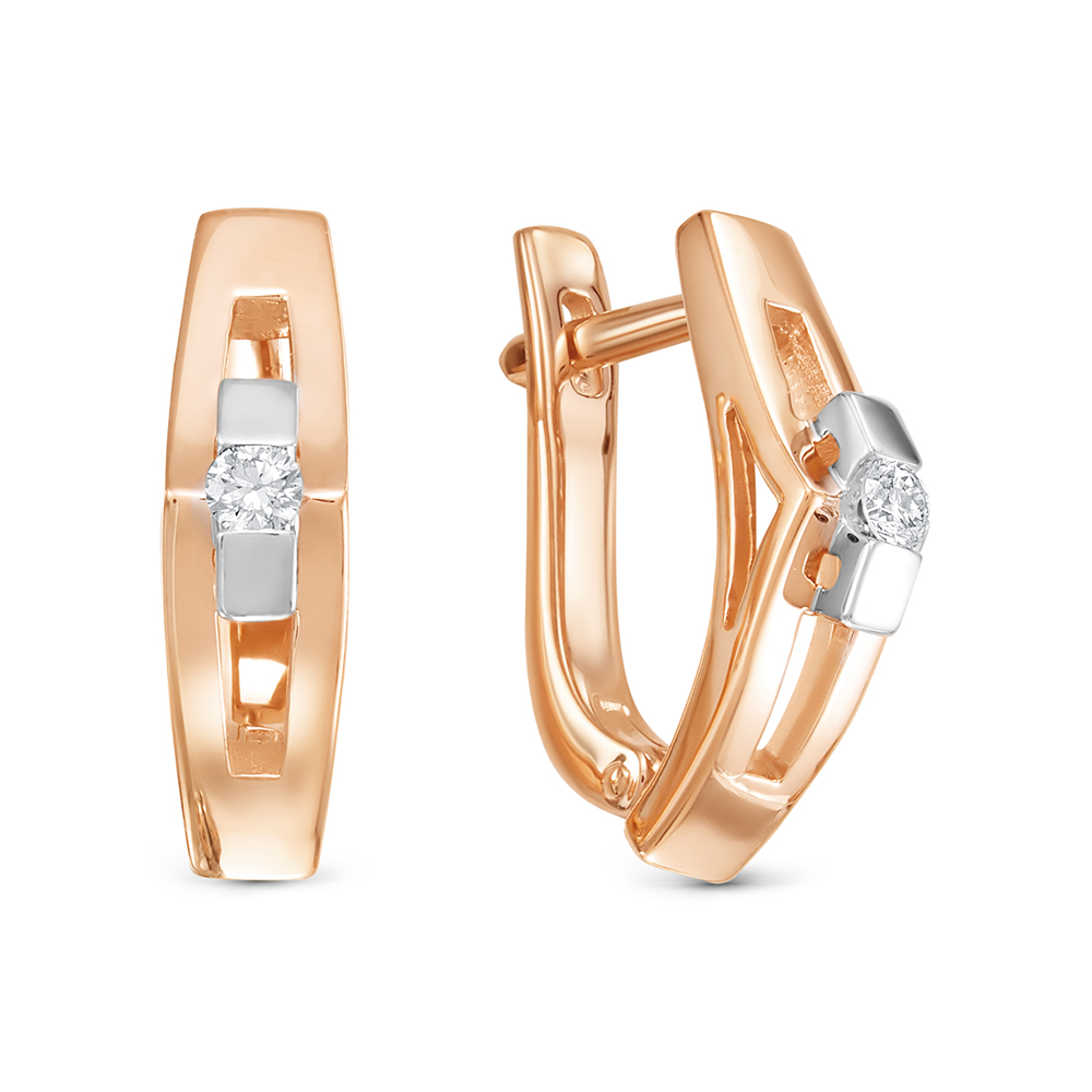 Современные классические серьги из красного золота с парой бриллиантов придутся по вкусу ценителям концептуального дизайна. Геометричная вставка белого золота и бриллиантов выглядит невероятно изысканно, дорого, но в то же время сдержанно и уместно. Английский тип замка прослужит долгие годы. Украшение представлено ювелирным брендом Brilliant Style.