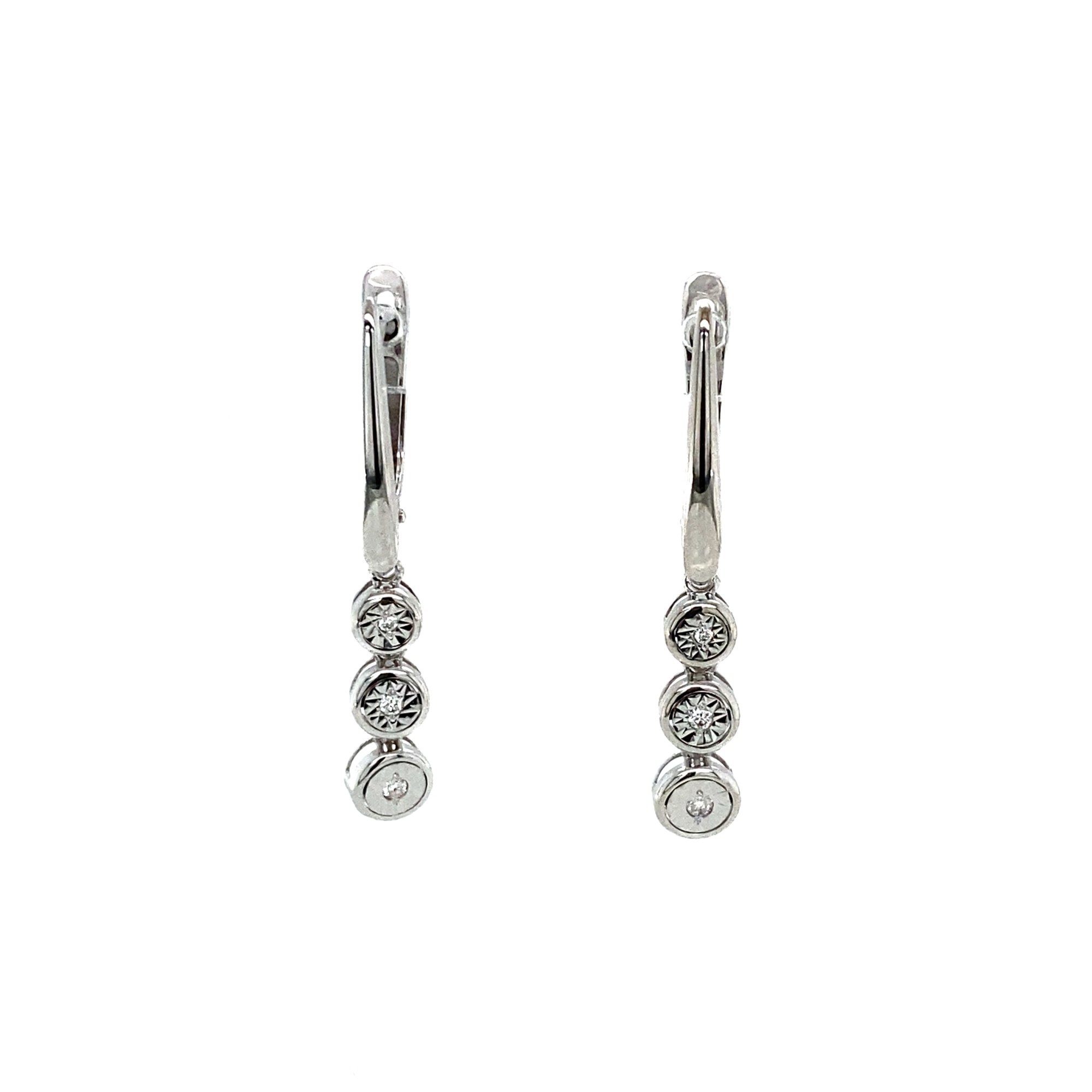 Оригинальные удлиненные серьги из белого золота, декорированные шестью бриллиантами – притягательный акцент для современного образа. Геометрический дизайн украшения и закрепка бриллиантов в белом золоте придает драгоценным камням объем и подчеркивает их природную красоту. Сияющие удобные серьги с практичным английским замком - прекрасное дополнение ювелирного гардероба или отличный вариант подарка.