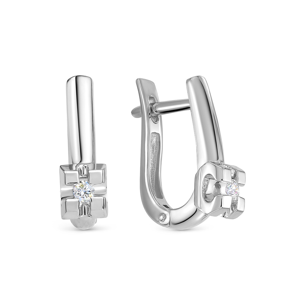 Стильные серьги из белого золота, декорированные двумя бриллиантами – притягательный акцент для современного образа. Геометрический дизайн и закрепка бриллиантов в белом золоте придает драгоценным камням объем и подчеркивает их природную красоту. Тип замка - английский, самый надежный и удобный. Покупайте золотые украшения исключительного качества по привлекательной цене в магазинах Мир Золота.