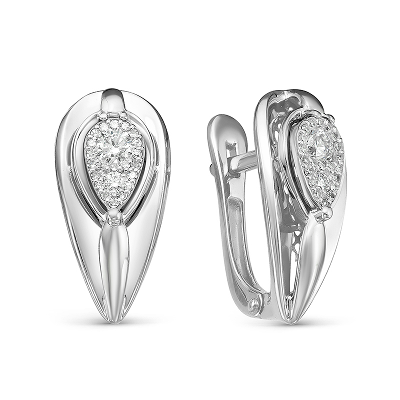 Серьги из белого золота украшенные притягательным бриллиантовым паве. Оригинальный дизайн, увенчанный манящим блеском бриллиантов, излучает красоту и изысканность, притягивая восхищенные взгляды. Безупречные мягкие и объемные линии белого золота кажутся роскошно воздушными и следуют трендовым преображениям классических украшений с учетом современной моды. Удобный и надежный английский вид застежки. Купите эффектные серьги по лучшей цене в магазинах Мир Золота.