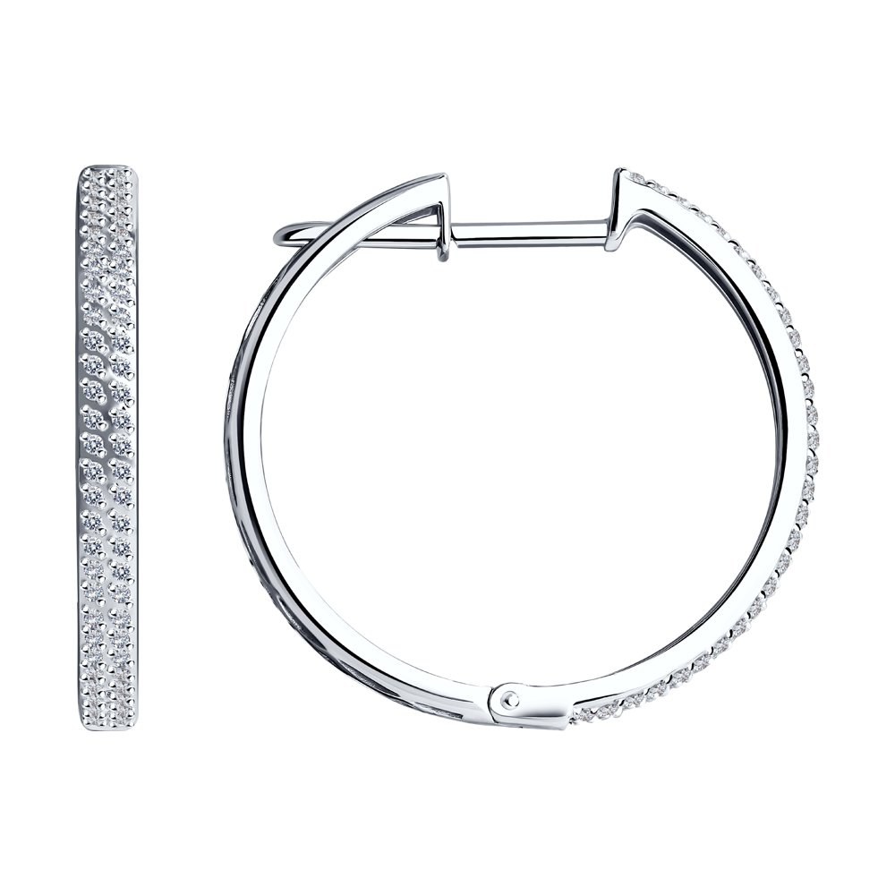 Шикарные серьги из белого золота 585 пробы с дорожкой из 116 бриллиантов. Модные во все времена круглые серьги со временем существенно изменились. Современный замок практичен и удобен в использовании, а интересный дизайн с дорожками бриллиантов позволяет надевать украшение не только на работу, но и на праздник, при этом они всегда выглядят элегантно и женственно.