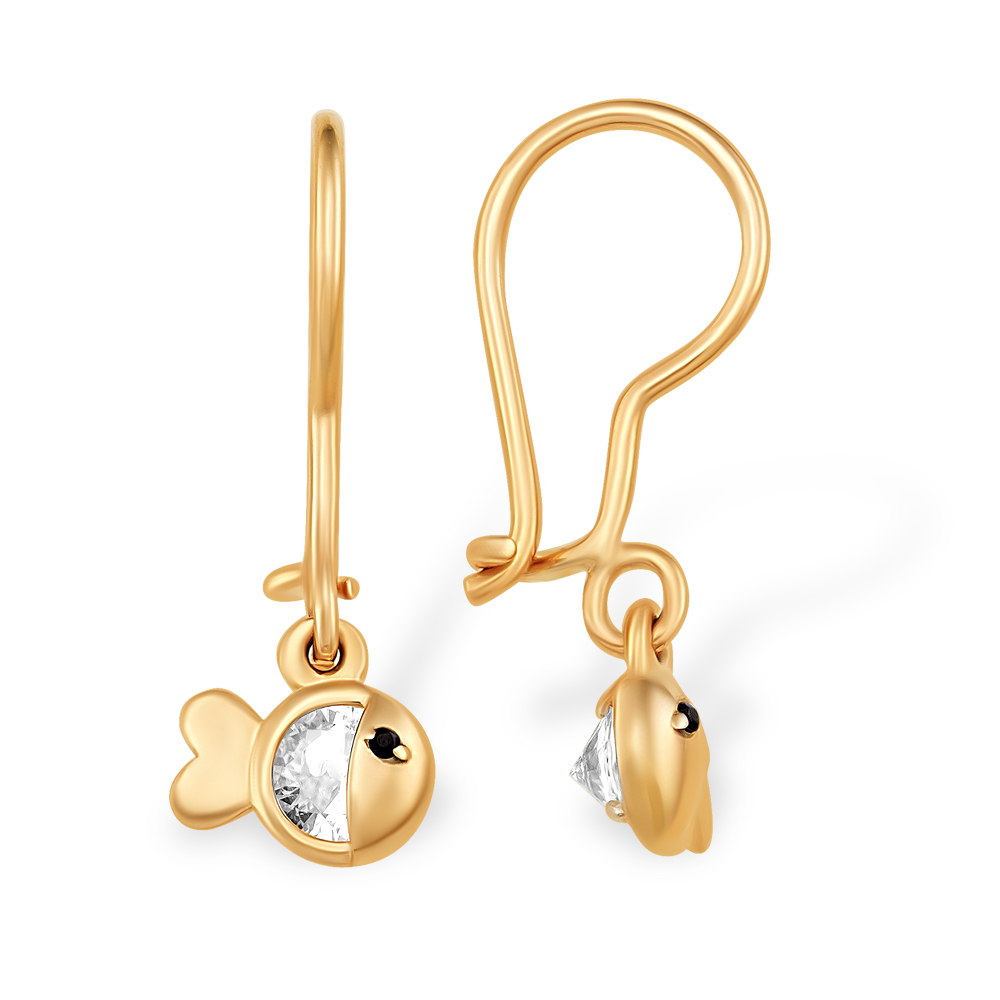 Детские серьги в виде золотых рыбок, украшенных фианитами, выполнены из красного золота 585 пробы. Чудесные рыбки с искристым сиянием камней станут незаменимым аксессуаром маленьких модниц. Надежный и комфортный французский замочек очень удобен для повседневной носки. Приобретайте детские украшения в подарок по выгодным ценам в магазинах Мир Золота.