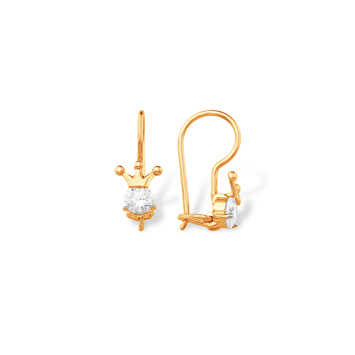 Очаровательные детские серьги, украшенные миниатюрными золотыми коронами и фианитами, выполнены из красного золота 585 пробы. Чудесное украшение привлекательного дизайна с кристальным сиянием камней - для настоящих маленьких принцесс! Изящные и легкие серьги с комфортной фиксацией на ушке будут лучшим подарком для девочки. Приобретайте очаровательные сережки по выгодным ценам в магазинах Мир Золота.