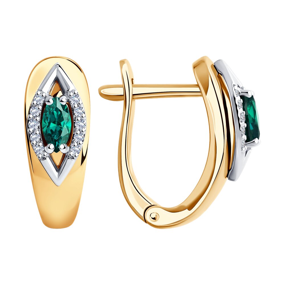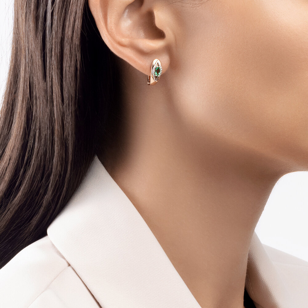 Превосходные серьги из красного и белого золота 585 пробы с бриллиантами и изумрудами. Изящный дизайн серег украшают зеленые изумруды фантазийной огранки "маркиз", в обрамлении прозрачных бриллиантов на фоне декора из белого золота. Сияние драгоценных камней дополнит образ шармом и очарованием. Приобретайте серьги по выгодным ценам в магазинах Мир Золота.
