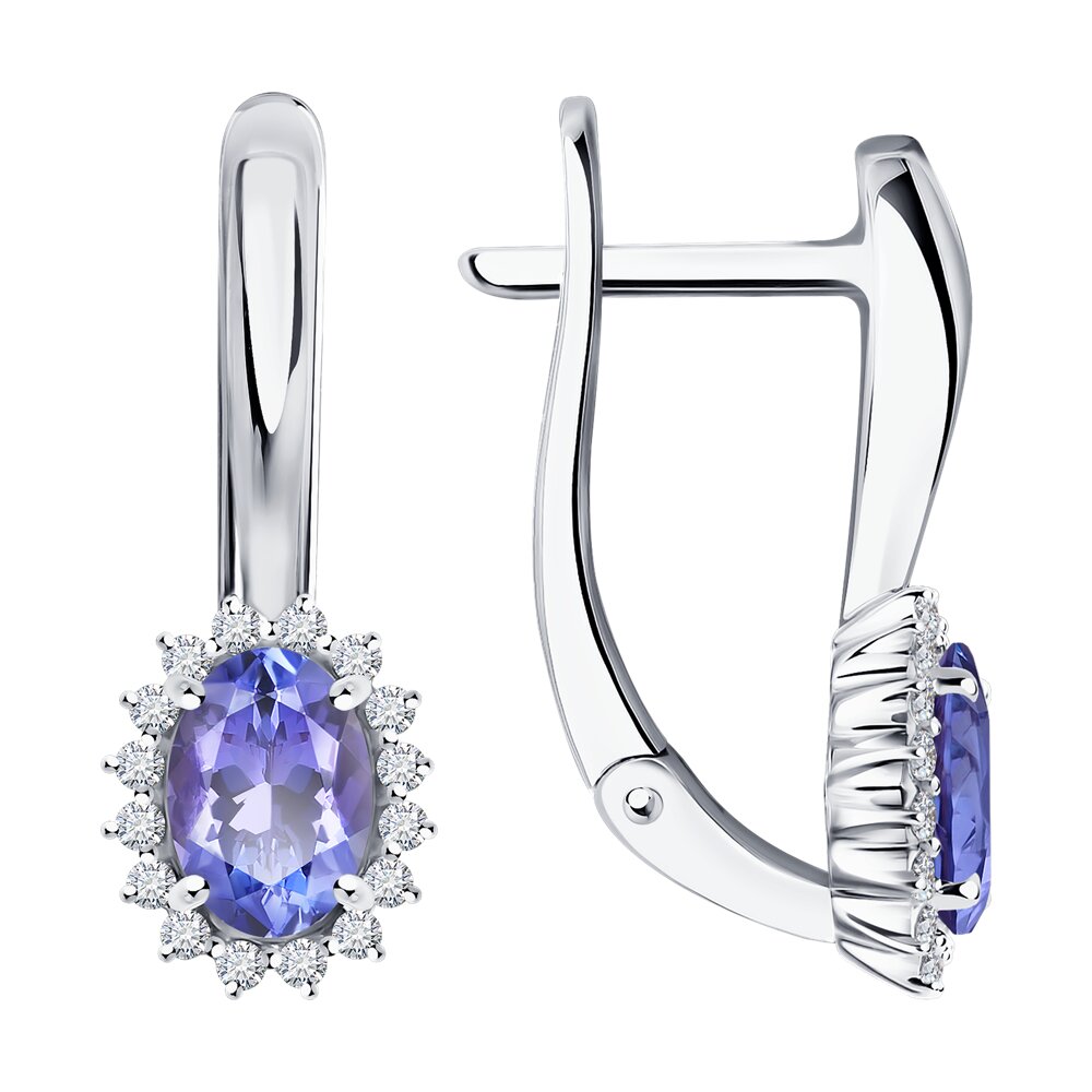 Классические серьги из белого золота 585 пробы с танзанитами и бриллиантами, выполнены в изящном дизайне. Превосходные танзаниты огранки овал приковывают внимание своим чарующим сиянием, а изысканный декор из обрамляющих бриллиантовых вставок выгодно дополняет эффектный образ украшения. Приобретайте великолепные серьги по выгодным ценам в магазинах Мир Золота.