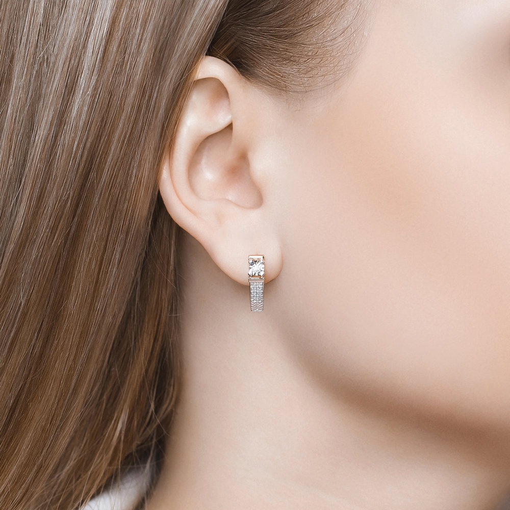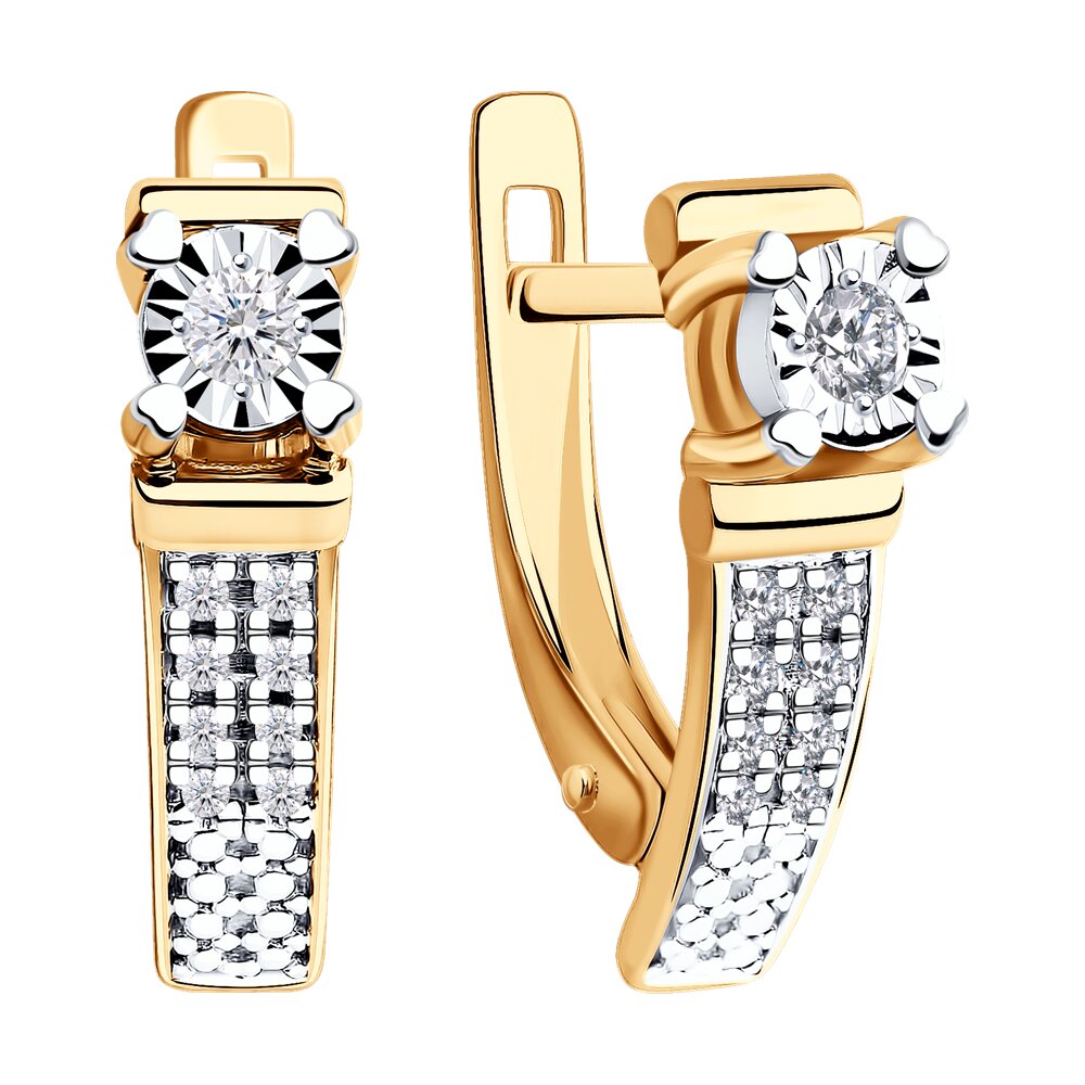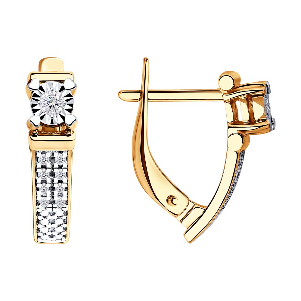 Классические серьги с английским замком из красного золота 585 пробы украшены паве из 16 ослепительных бриллиантов на акцентной вставке из белого золота и инкрустированы двумя крупными бриллиантами. Это по праву можно считать роскошным украшением, без которого не обойтись ни одной девушке. Бриллианты всегда уместны, а английский тип застёжки признан одним из самых надёжных и комфортных. Кроме того, такое украшение безупречно подойдет под любой наряд и образ.