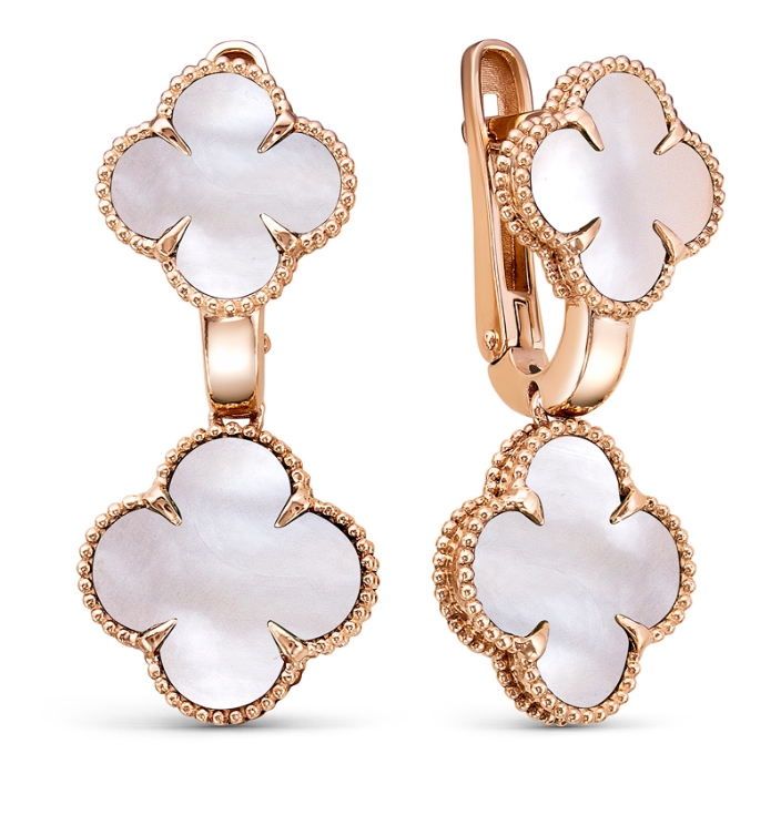 Очаровательные золотые серьги в форме клевера с белым перламутром сделают женский образ еще ярче и привлекательнее. Акцентное и нарядное украшение из красного золота притягивает к себе внимание, и подчеркнет истинную женственность и индивидуальность владелицы. Приобретайте ювелирное украшение по выгодным ценам в магазинах Мир Золота.