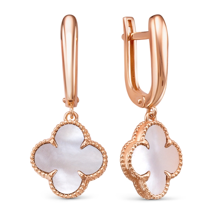 Серьги «Клевер» с подвесками с белым перламутром выполнены из красного золота 585 пробы. Очаровательные серьги привлекают внимание своей красотой и нежным сиянием перламутра. Украшение с изящным дизайном смотрится очень аккуратно, но при этом выразительно и стильно. Серьги станут отличным дополнением женственного образа и эффектным подарком для ваших близких. Приобретайте украшение по выгодным ценам в магазинах Мир Золота.