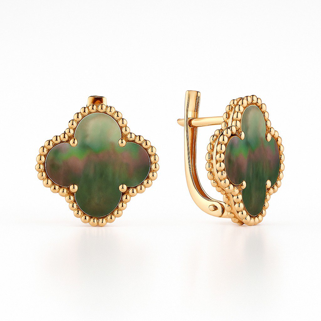 Привлекательные серьги в форме четырехлистника с перламутром выполнены из красного золота 585 пробы с английским замочком. Серьги с оригинальным дизайном и удивительным блеском черного перламутра привлекают внимание, и эффектно дополнят стильный женский образ. Приобретайте ювелирное украшение по выгодным ценам в магазинах Мир Золота.