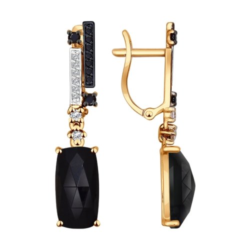 Оригинальные серьги выполнены из красного золота в интересном дизайне и декорированы черными агатами и фианитами. Украшение привлекает внимание эффектным сочетанием загадочных черных агатов с контрастным блеском прозрачных и черных фианитов, образующих стильную композицию. Приобретайте ювелирное украшение по выгодным ценам в магазинах Мир Золота.