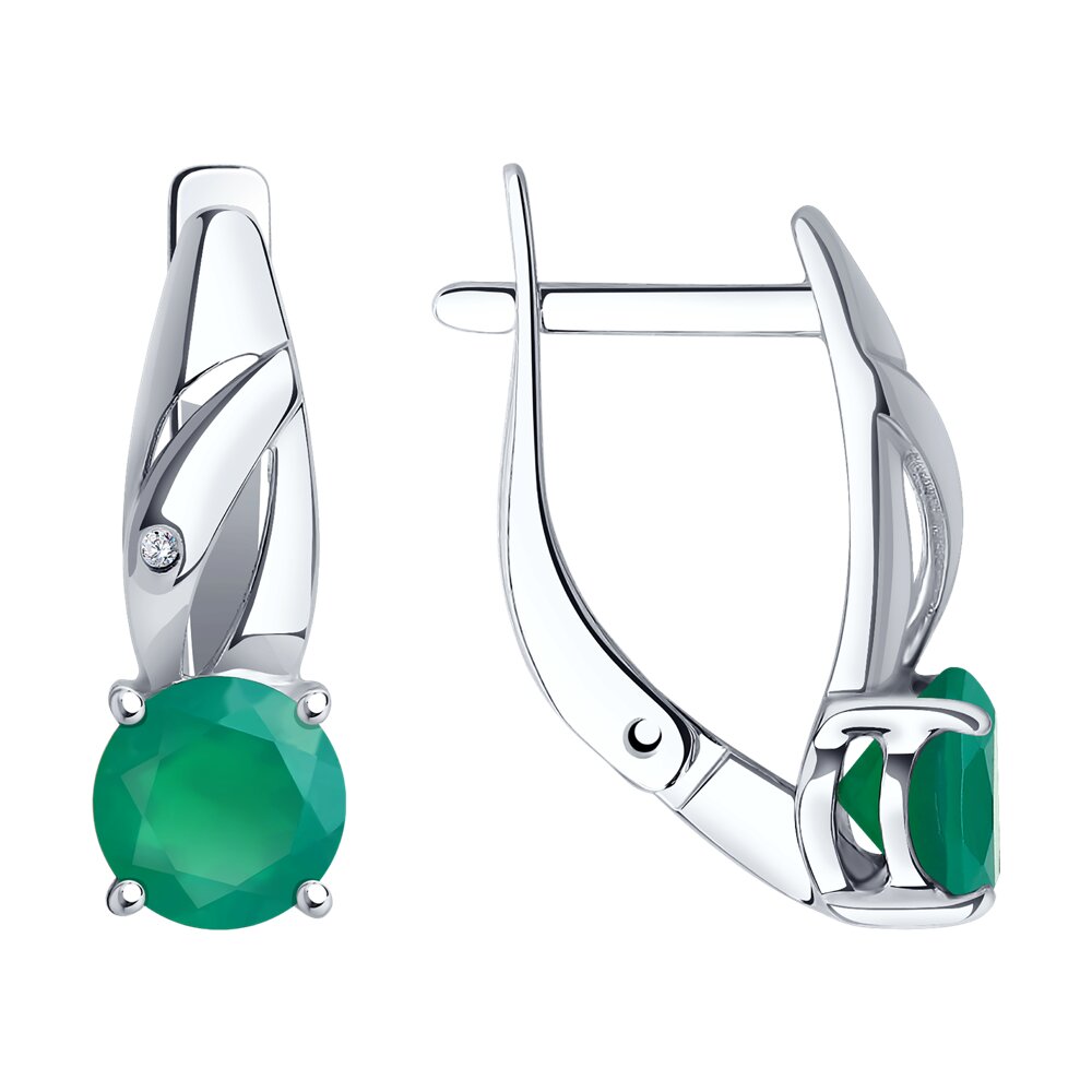 Очаровательные серьги с зелеными агатами и бриллиантами выполнены из родированного серебра. Аккуратные серьги красивого дизайна с агатами насыщенного оттенка и драгоценными бриллиантами сделают образ женщины более привлекательным, и будут незаменимой деталью повседневного образа. Приобретайте ювелирное украшение в подарок выгодно в магазинах Мир Золота.