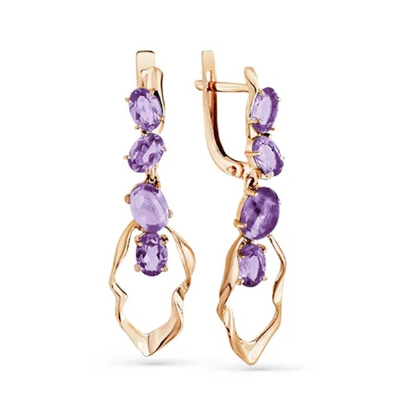 Удлиненные женские серьги с подвесками украшены натуральными аметистами и выполнены из красного золота 585 пробы. Легкий привлекательный дизайн дополняет нежное переливчатое сияние аметистовых вставок. Очаровательное украшение идеально подчеркнет утонченный образ обладательницы. Приобретайте ювелирное украшение в подарок по выгодной цене в магазинах Мир Золота.