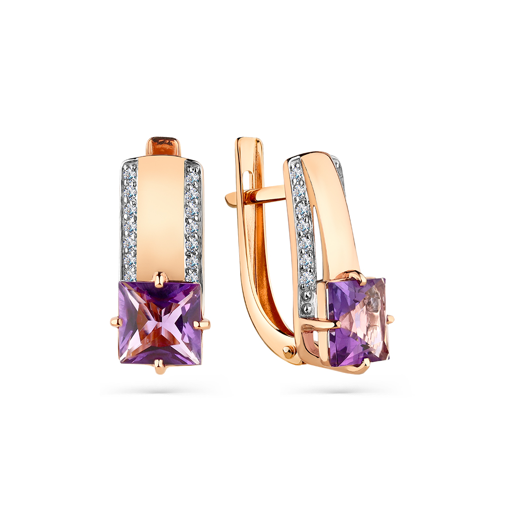 Классические серьги из красного золота 585 пробы, декорированы привлекательными аметистами квадратной огранки, удивительный блеск которых подчёркивают строгие дорожки кристальных фианитов. Это притягательное украшение отлично подойдёт как к повседневному, так и праздничному образу. Приобретайте ювелирное украшение по выгодной цене в магазинах Мир Золота.