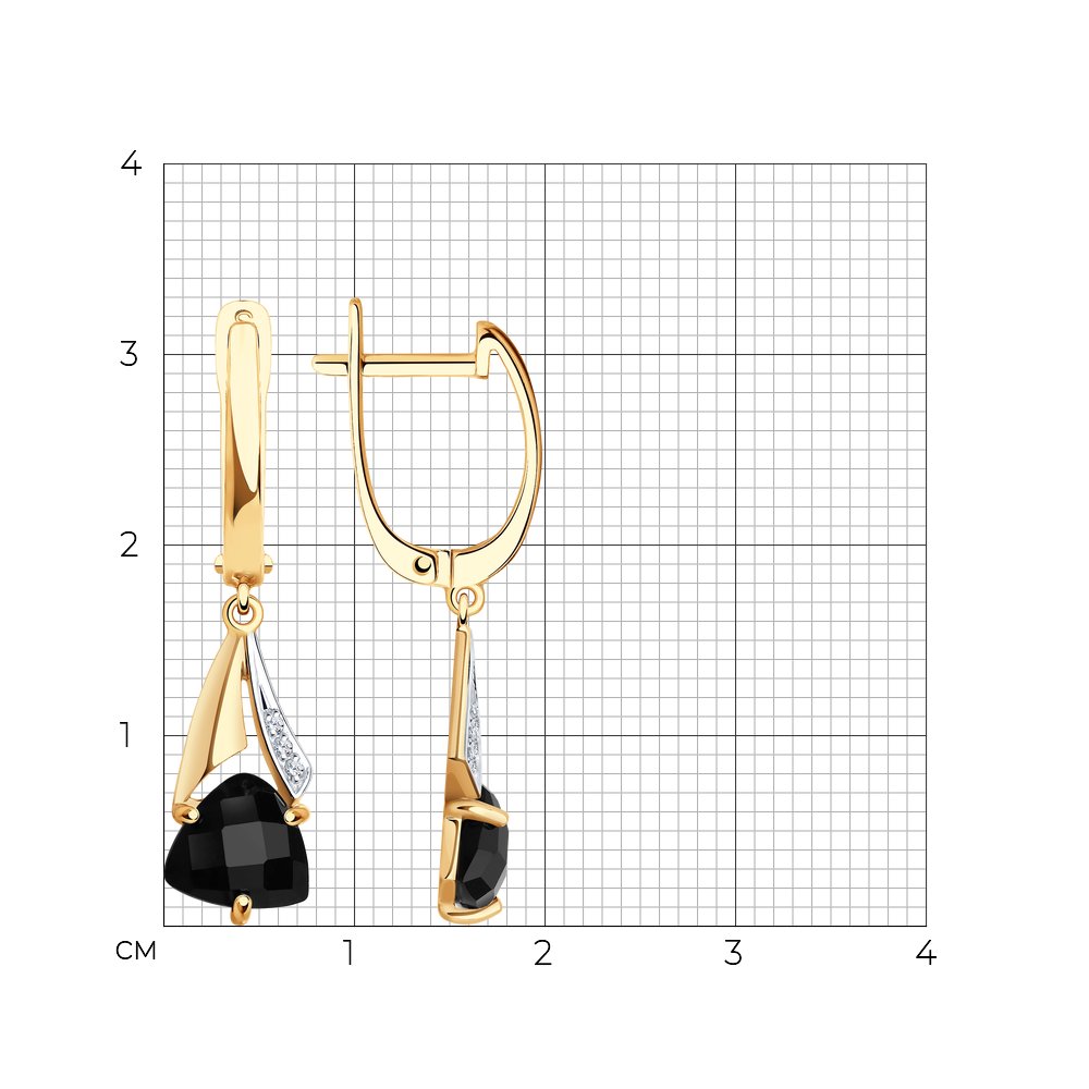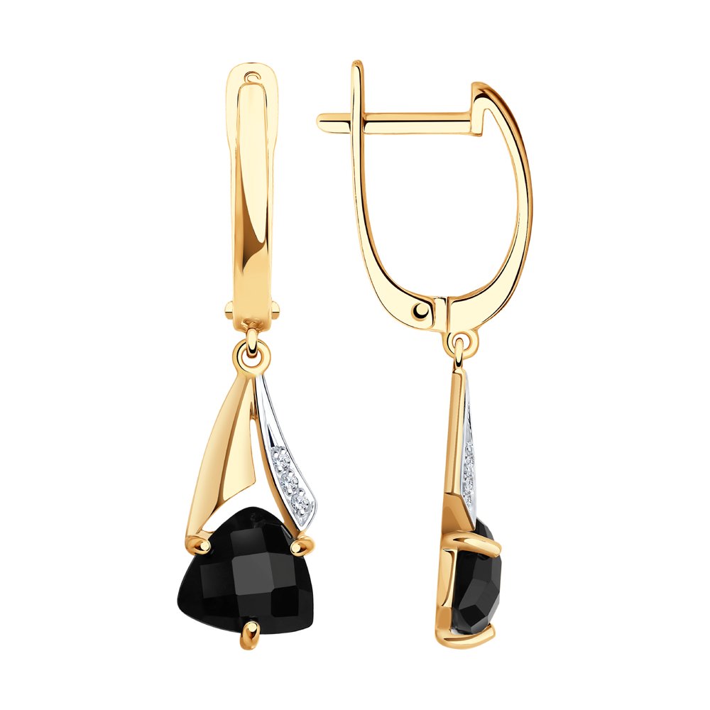 Серьги с подвесками с черными агатами и фианитами выполнены из красного золота. Украшение с красивым сиянием агатов эффектной огранки и кристальным блеском фианитов смотрится изящно и нежно. Эффектное сочетание черных и прозрачных камней отлично дополняет очаровательный дизайн украшения. Приобретайте ювелирное украшение по выгодным ценам в магазинах Мир Золота.