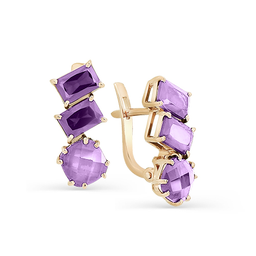 Женские серьги с полудрагоценными аметистами выполнены из красного золота 585 пробы. Эффектная огранка натуральных камней идеально подчеркивает их природную красоту и удивительное сияние. Яркое и выразительное украшение позволит создать стильный привлекательный образ. Приобретайте ювелирное украшение по выгодной цене в магазинах Мир Золота.