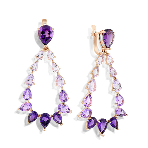 Роскошные серьги с подвесками выполнены из красного золота 585 пробы и украшены натуральными аметистами разных оттенков. Насыщенные краски лаванды воплотились в ярком миксе завораживающих камней фигурной огранки, создающем эффектный образ украшения. Серьги станут безупречным завершением вечернего образа, и помогут произвести неизгладимое впечатление. Приобретайте украшение по выгодным ценам в магазинах Мир Золота.