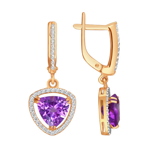 Изысканные серьги с подвесками, из красного золота 585 пробы с натуральными аметистами и фианитовыми дорожками. Обворожительный блеск ювелирных камней сделает женский образ более загадочным и привлекательным. Серьги будут лучшим дополнением утонченного образа, и изящно украсят классический и вечерний стиль. Приобретайте украшение по выгодным ценам в магазинах Мир Золота.