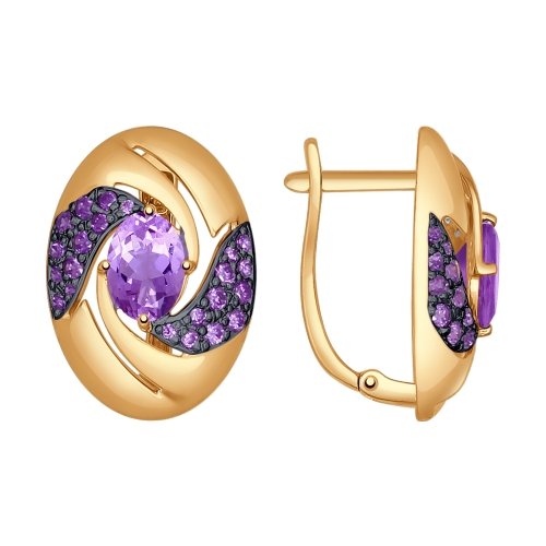 Стильные серьги из красного золота 585 пробы с аметистами и сиреневыми фианитами. Переливчатый блеск цветных камней в сочетании с благородным золотом добавит женскому образу особого блеска и очарования. Превосходные серьги будут радовать вас своим безупречным сиянием, и идеально дополнят выразительный элегантный образ. Приобретайте украшение по выгодным ценам в магазинах Мир Золота.