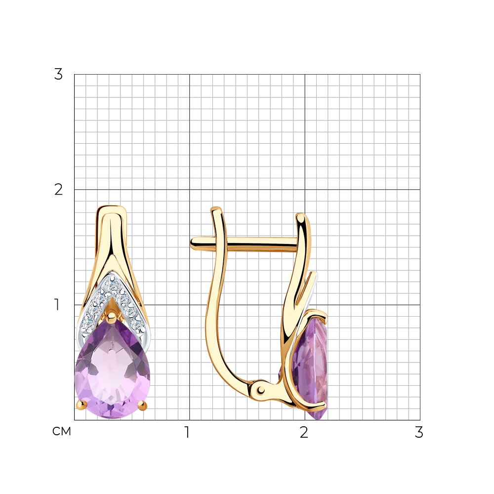 Изящные серьги выполнены в красивом дизайне из красного золота 585 пробы с фианитами и аметистами. Кристальные фианиты выгодно подчеркивают насыщенный фиолетовый оттенок натуральных аметистов. Нарядный образ сережек заметно преобразит любой привычный облик. Приобретайте ювелирное украшение по выгодным ценам в магазинах Мир Золота.