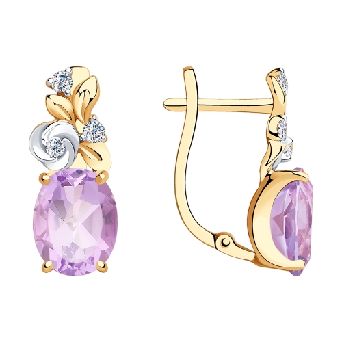 Восхитительные серьги из красного золота 585 пробы с крупными натуральными аметистами и сверкающими фианитами очень женственно и красиво смотрятся. Серьги изумительного дизайна с обворожительным блеском ювелирных камней станут очаровательной деталью неповторимого образа обладательницы. Приобретайте золотое украшение по выгодным ценам в магазинах Мир Золота.