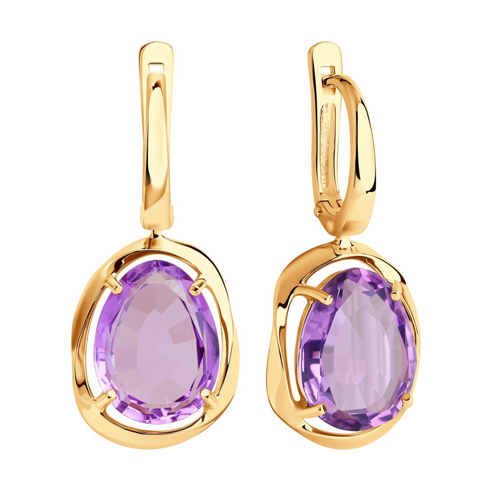 Великолепные серьги с подвесками выполнены из красного золота 585 пробы с превосходными сиреневыми аметистами. Яркие серьги с невероятным блеском натуральных камней прекрасно смотрятся и привлекают внимание. Украшение идеально дополнит нарядные образы, подчеркнув красоту и женственность владелицы. Приобретайте ювелирное украшение по выгодным ценам в магазинах Мир Золота.