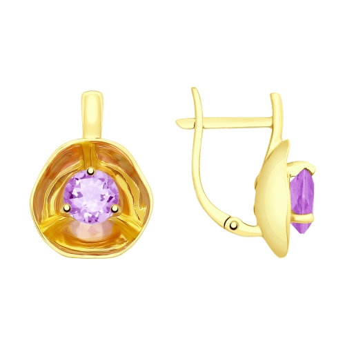 Очаровательные серьги необычного дизайна выполнены из красного золота 585 пробы с натуральными аметистами. Замечательное украшение с удивительным цветным сиянием полудрагоценных камней оригинально смотрится, и станет ярким акцентом и стильной деталью современного образа обладательницы. Приобретайте ювелирное украшение по выгодным ценам в магазинах Мир Золота.