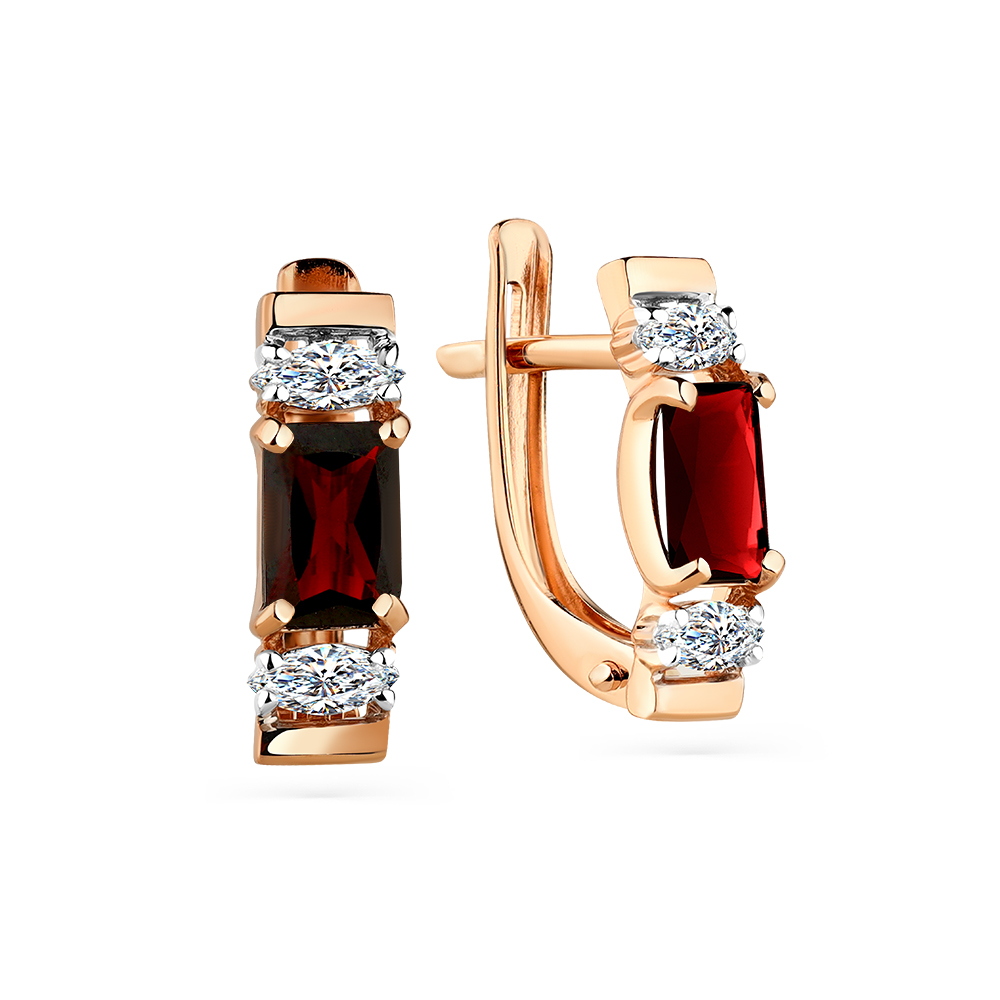 Женские серьги с гранатами и фианитами выполнены из красного золота 585 пробы. Сверкающие фианиты фигурной огранки подчеркивают насыщенный цвет ярких привлекательных гранатов. Изумительный блеск камней в отражении благородного металла привлекает внимание, серьги эффектно дополнят любой выбранный образ. Приобретайте ювелирное украшение в подарок по выгодной цене в магазинах Мир Золота.