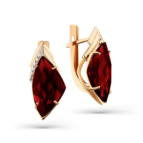 Привлекательные серьги, из красного золота 585 пробы, с гранатами оригинальной огранки и прозрачными фианитами ярко и стильно смотрятся. Насыщенный блеск крупных гранатов, подчеркнутый искристыми мини-дорожками из фианитов, не останется незамеченным. Выразительное украшение наполнит женский образ благородным блеском и яркими красками. Приобретайте серьги по выгодной цене в магазинах Мир Золота.