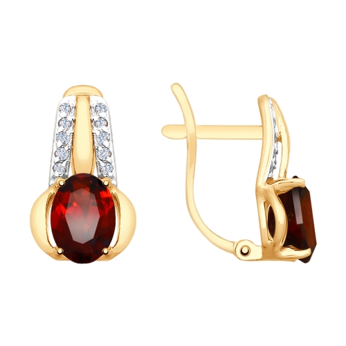 Замечательные женские серьги из красного золота 585 пробы с натуральными гранатами и фианитами заметно преобразят привычный женский образ. Притягательные яркие гранаты винного оттенка окутаны мягким блеском драгоценного металла, сияющие дорожки с прозрачными фианитами идеально подчеркивают их насыщенный глубокий цвет. Приобретайте ювелирное украшение по выгодным ценам в магазинах Мир Золота.